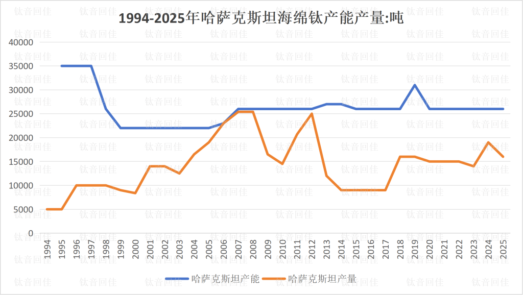 Рис. Объем производства губчатого титана в Казахстане в 1994–2025 гг.: в тоннах