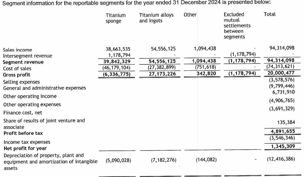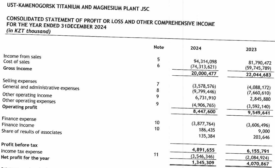 Рисунок. Отчет о прибылях и убытках за 2024 год завода по производству титана и магния в Ускамане