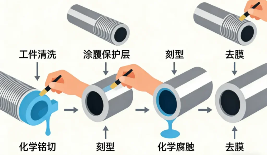 Гравировка является важным подготовительным этапом перед химической фрезеровкой, основной целью которой является точное определение зоны обработки титанового сплава для удаления защитного покрытия с участков, требующих фрезерования. Этот процесс требует максимальной точности, что обусловливает необходимость использования специально подготовленных шаблонов. Гравировальный инструмент используется для надрезания по определенной границе коррозии, разрывая защитный слой перед удалением ненужного покрытия — процедура, также называемая «декоатированием». Снятие защитного слоя должно выполняться с особой осторожностью: края защитного слоя должны оставаться неповрежденными, а поверхность области, требующей химического фрезерования, должна быть полностью очищена от остатков покрытия. Любые несоответствующие требованиям области должны быть незамедлительно исправлены, так как невыполнение этого требования напрямую повлияет на эффективность последующего химического травления, что приведет к смещению зоны обработки.