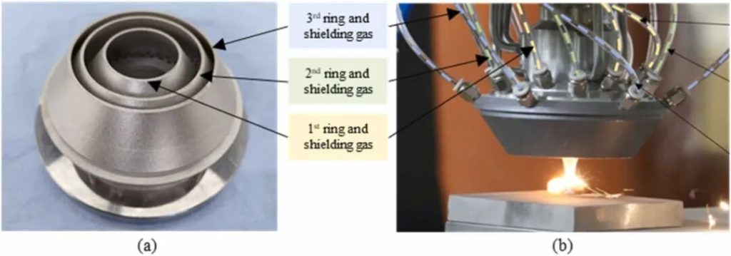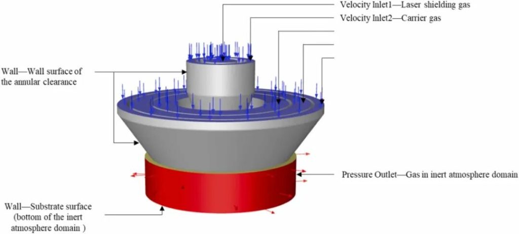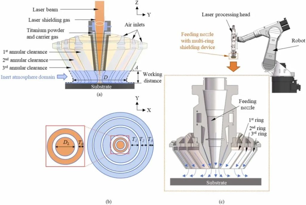 01 Речь идет не просто о «защите плавильной ванны», а о том, «как создать устойчивую и поддающуюся количественной оценке зону с низким содержанием кислорода». В традиционном понимании локальная защита титановых сплавов обычно заключается в том, чтобы обернуть соосное сопло для подачи порошка кольцом защитного газа, стараясь максимально покрыть плавильную ванну. Однако проблема заключается в том, что область защиты при таком подходе зачастую ограничена, а оптимизация параметров в значительной степени зависит от опыта: слишком большой расход газа может нарушить поток порошка, а слишком малый — не обеспечит достаточную защиту; при различных конфигурациях и размерах заготовок часто требуется повторное пробное налаживание. Отправная точка данной статьи ясна: авторы не просто создают еще один защитный колпачок, «добавляя больше аргона», а рассматривают проблему локальной защиты как задачу построения поля газового потока. В статье предложена трехкольцевая система динамической защиты инертным газом, и четко указано, что целью должно быть формирование «равномерной, достаточно большой и стабильной» зоны с низким содержанием кислорода. То есть защита больше не является просто качественным описанием, а ее эффективность необходимо оценивать с помощью таких величин, как диаметр зоны с низким содержанием кислорода, распределение концентрации кислорода и стабильность поточного поля. Это очень важно, поскольку позволяет превратить локальную защиту, которая в прошлом в значительной степени зависела от опыта, в задачу, которую можно спроектировать, рассчитать и проверить.