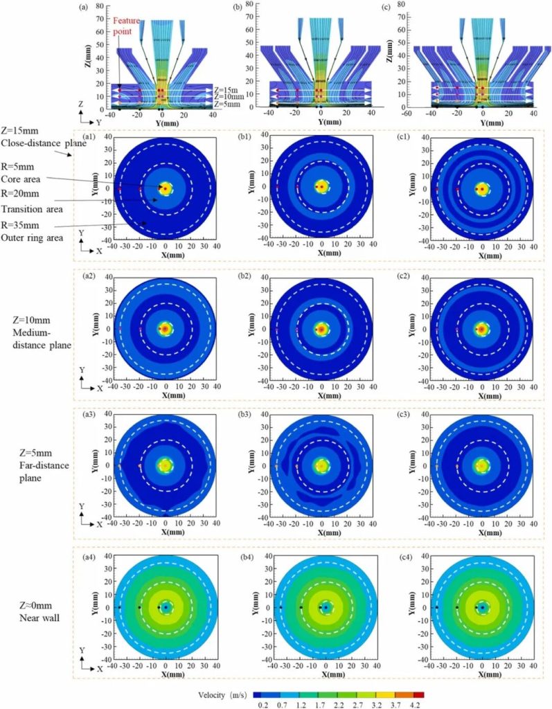 Графики распределения поля течения. (a–c) Распределения скоростей в плоскости Y–Z в режимах работы с одним кольцом, синергией двух колец и синергией трёх колец; (a1–a4) Соответствующие распределения в плоскости X–Y при Z = 15, 10, 5 и 0 мм для работы с одним кольцом; (b1)-(b4) Распределения в плоскости X-Y для двухкольцевого режима при Z = 15, 10, 5 и 0 мм; (c1)-(c4) Распределения в плоскости X-Y для трехкольцевого режима при Z = 15, 10, 5 и 0 мм.