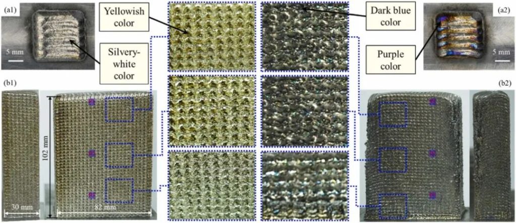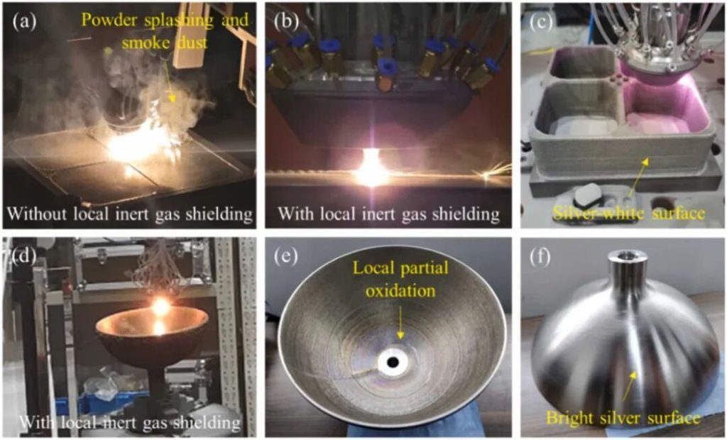 04 Дело не только в красивом распределении потока, но и в том, что нанесение титанового сплава в открытой среде действительно удалось. В конечном счете, для исследований такого рода, посвященных локальной защите, все сводится к результатам, полученным с материалами. В статье описаны эксперименты по LDED с Ti-6Al-4V, проведенные в кислородной среде. Результаты показывают, что при многокольцевой локальной защите поверхность наплавленного слоя и основного металла приобретает серебристо-белый или светло-желтый оттенок, а не темный цвет, характерный для сильного окисления. Это изменение цвета поверхности само по себе является весьма убедительным технологическим сигналом, свидетельствующим о значительном снижении степени окисления. Более того, авторы отмечают, что в условиях локальной инертной атмосферы также наблюдается значительное подавление разлета порошка и образования дыма, причем степень подавления кислорода превышает 23,8 %. На самом деле это не просто означает, что «рабочая зона стала чище». Снижение разлета порошка и дыма означает большую стабильность локальной среды в зоне плавления и потока порошка, что положительно сказывается на однородности наплавки, межслойной связи и формировании конечной структуры. То есть ценность этой системы заключается не только в изоляции от кислорода, но и в одновременном улучшении общей стабильности процесса наплавки в открытой среде. Для ремонта крупногабаритных деталей на месте это имеет большее инженерное значение, чем просто низкий уровень кислорода.