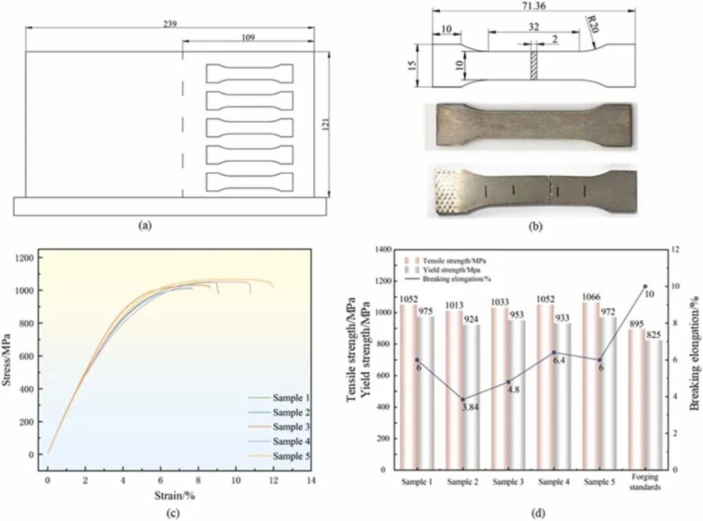Определение механических свойств деталей, изготовленных методом напыления Ti6Al4V. (a) Извлечение образцов; (b) Конструкция образцов и фактические образцы до и после испытаний; (c) Кривые «напряжение-деформация»; (d) Результаты определения механических свойств.